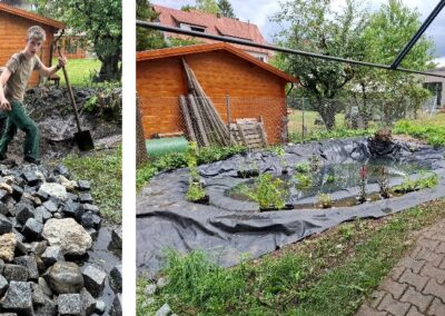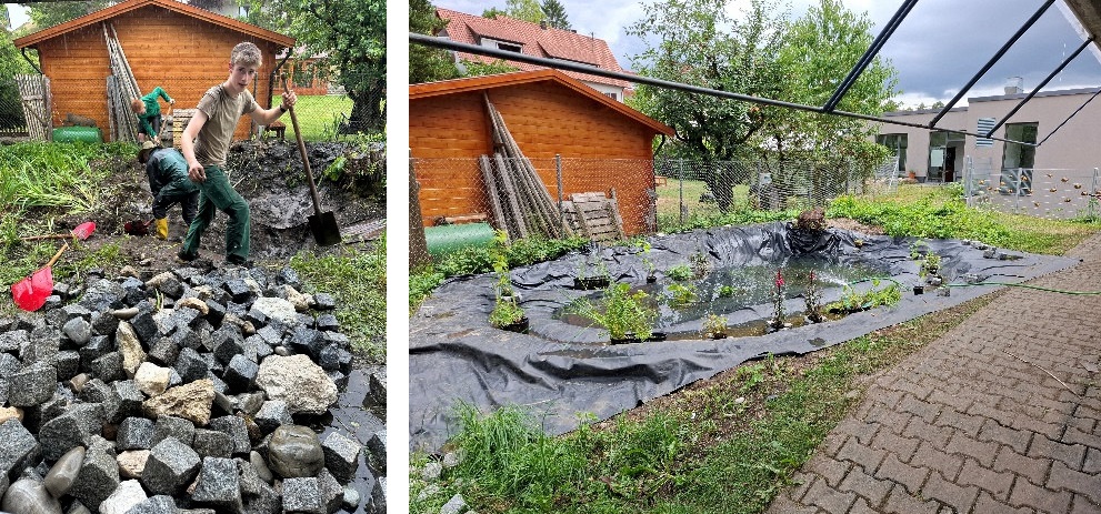 Im Zusammenspiel mit der Klasse 5 wurde der vorhandene Teich komplett rückgebaut und neu angelegt. Der Teich ist u.a. für die nebenan wohnenden Bienen zum Wasser holen sehr wichtig und daher ein weiteres Puzzleteil, um den Bienen und anderen Insekten zu helfen.
